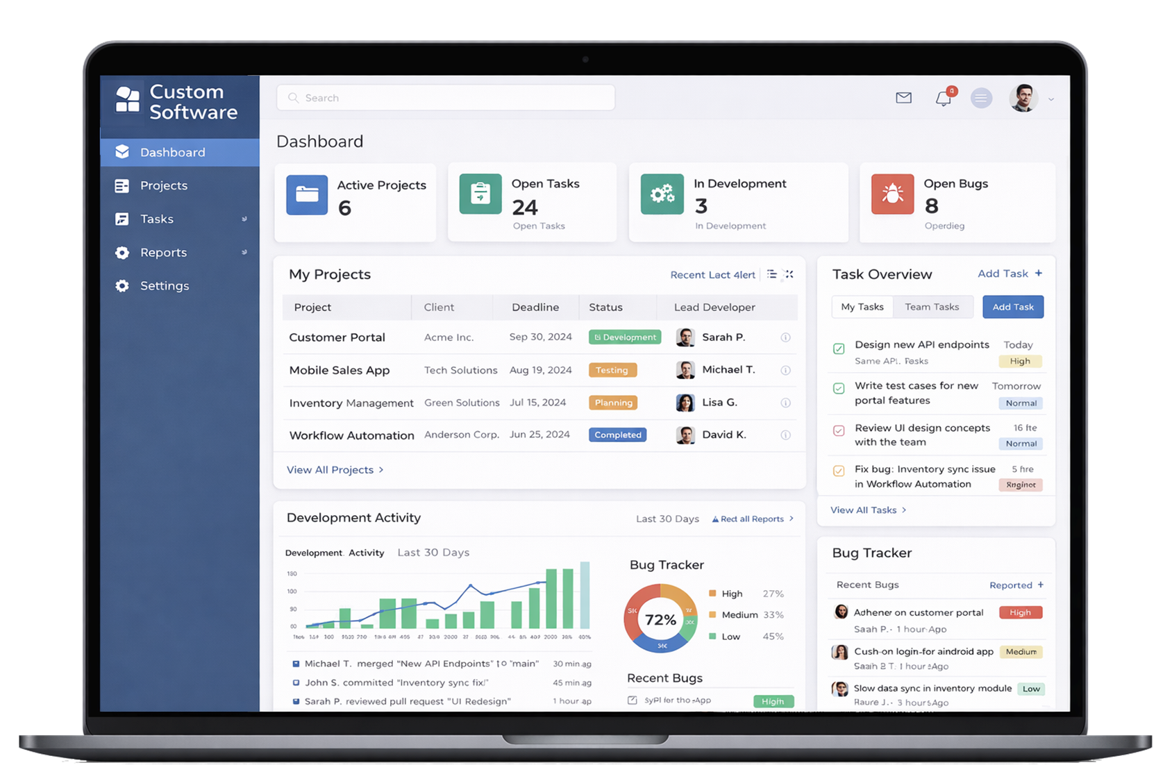 Our development approach emphasizes clean architecture, maintainability, security, and integration capability. Custom software is designed to seamlessly integrate with existing CRM, ERP, UEM, or cloud environments, ensuring long-term value and adaptability as business needs evolve.